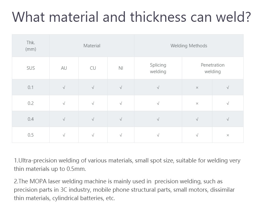 - Ultra-precision welding of various materials, small spot size, suitable for welding very thin materials up to 0.5mm